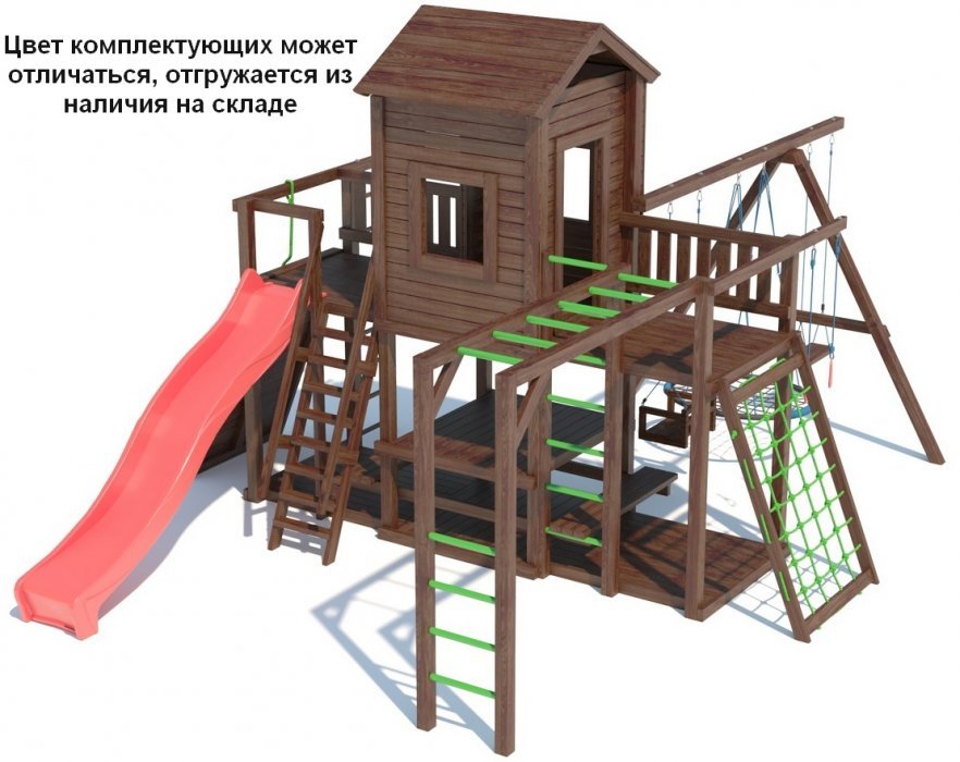 Фурнитура от европейского производителя «КВТ» (скаты, сидения для качелей, игрушки, канаты, крепежи), надежная и долговечная, защищена от воздействия УФ излучения (не выгорает), влагостойкая и морозостойкая, диапазон эксплуатации от - 60°С до +60°С. Пластиковый скат обладает отличной скользящей поверхностью, защитой от воздействия солнечных лучей (не греется, не выгорает), не образует статического напряжения, можно использовать как водную горку.