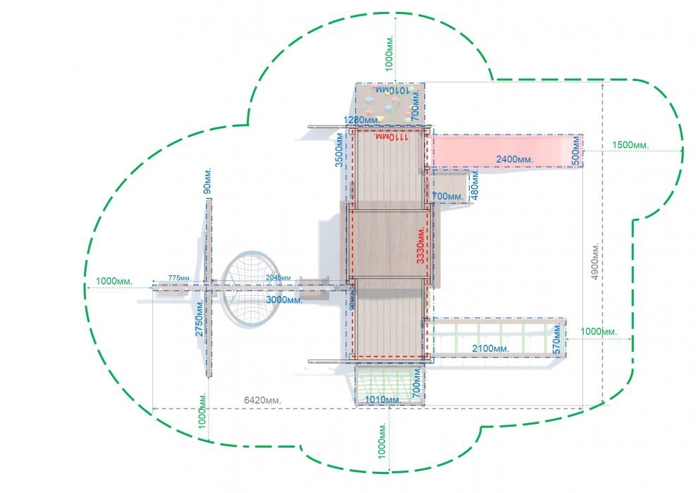 Площадь поверхности детской площадки = габариты конструкции по крайним точкам + 1000/1500мм. по периметру конструкции. Поверхность должна быть твердой, ровной, свободной от насаждений, горизонтальной без перепадов, допустимый уклон не более 20мм. на 10п.м.