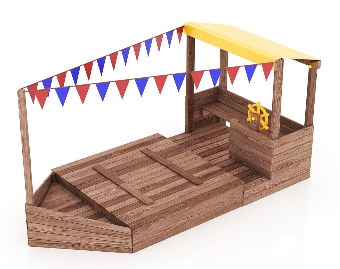 Детская песочница-кораблик и штурманская рубка со штурвалом.