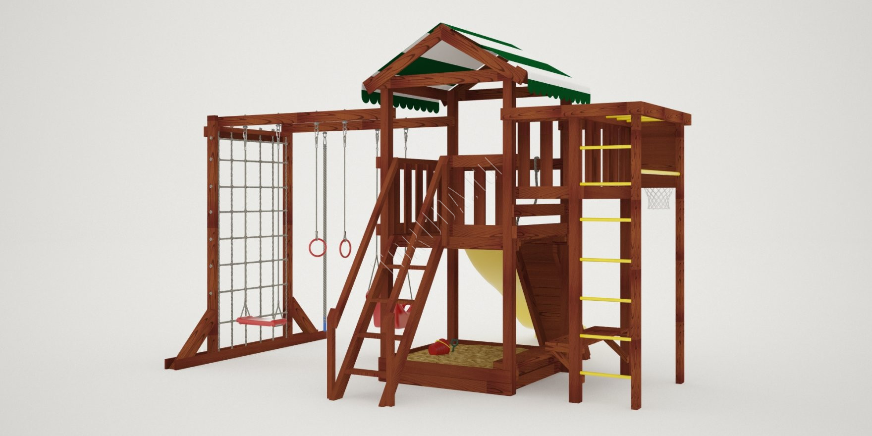Укреплять мышечный каркас нужно с детства, бросая мяч в баскетбольное кольцо, вися на турнике и кольцах, карабкаясь по шведской стенке, канату, сетке-лазалке. Все это многообразие спортивных снарядов присутствует в Гарда 4 Бри. Для большей радости качели «Лодочка» и «Люкс» со спинкой.