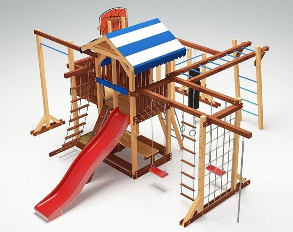 - Детская игровая площадка оснащена настоящим баскетбольным кольцом и подвесной боксёрской грушей.