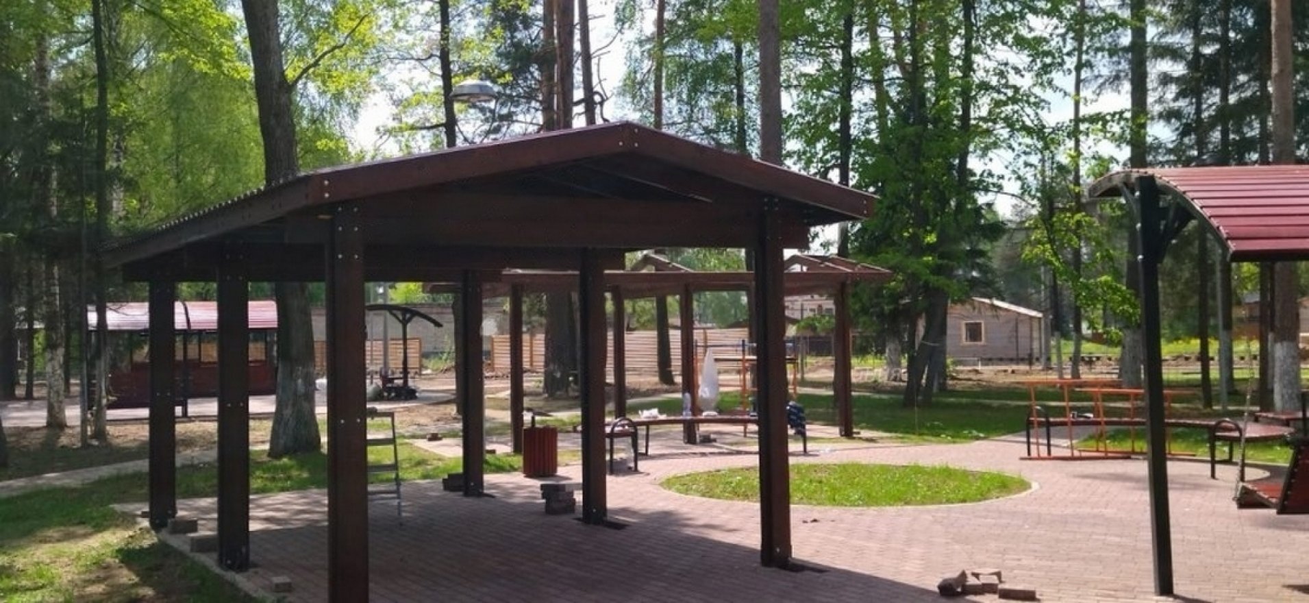 Деревянные элементы: Брус из хвойных пород древесины. Покрытие - атмосферостойкая лессирующая акриловая пропитка с лаком. Стандартные цвета: Палисандр, Махагон, Тик.