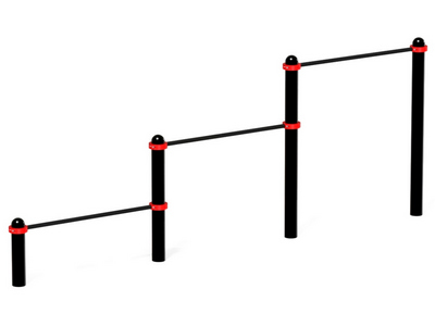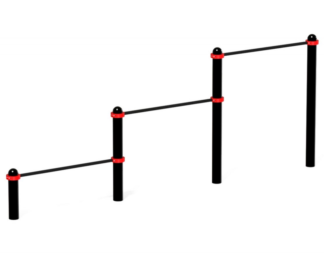 Высота опорных столбов составляет от 500 до 1500 миллиметров. На них на высоте 400 мм, 900 мм и 1400 мм закрепляются перекладины, которые удерживаются стальными хомутами. Благодаря такой конструкции их высоту можно отрегулировать в соответствии с требованиями занимающихся.