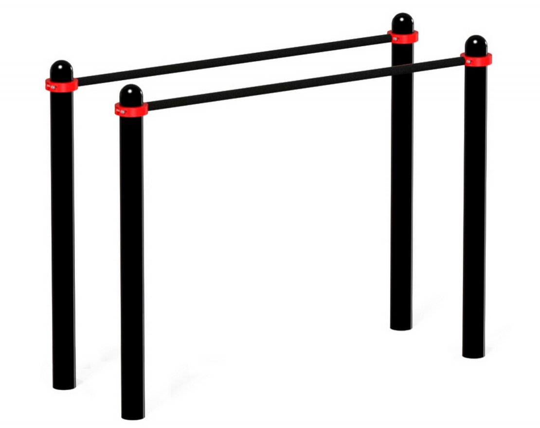 Брусья дают возможность легко организовать как индивидуальные, так и групповые занятия воркаутом на спортивной площадке или в любом дворе. В качестве несущей конструкции используется 4 опорных столба с полусферическими заглушками высотой 1400 миллиметров, между которыми на высоте 1200 мм параллельно друг другу закрепляются стальные жерди с рабочей поверхностью 1800 миллиметров. Диаметр жердей 48 мм. Они производятся из толстостенной трубы, которая обеспечивает повышенную устойчивость к нагрузке.