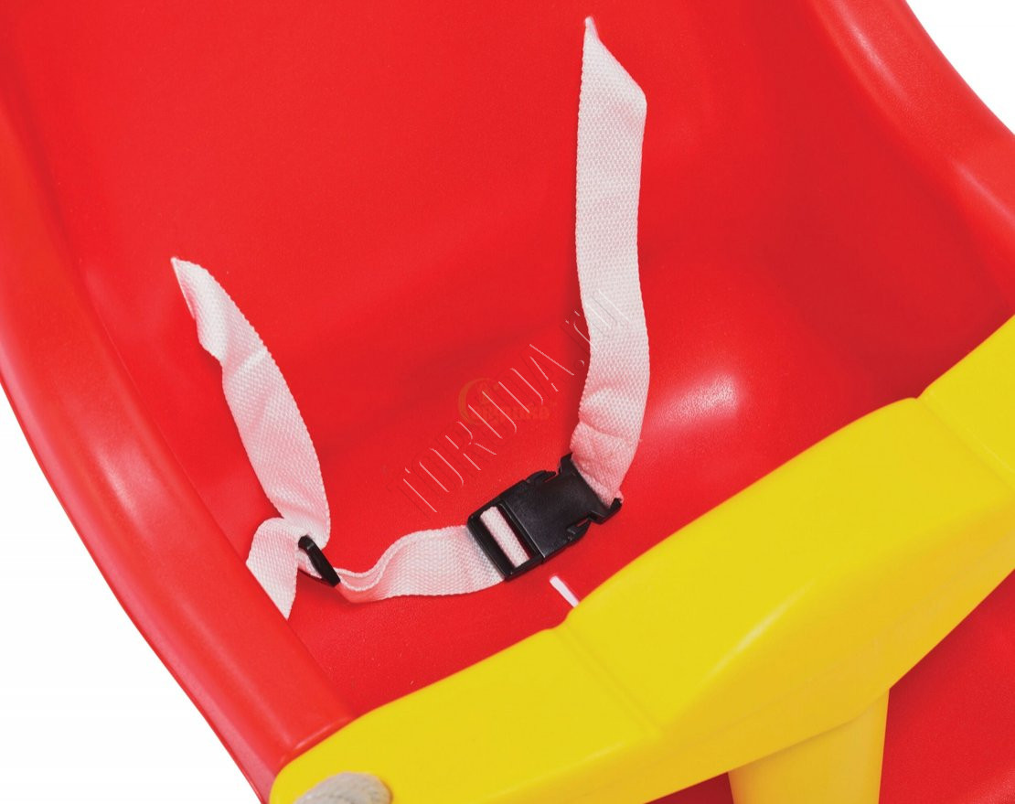 Качели оснащены снимающимся разделителем, который препятствует выпадению ребёнка, и ремнём безопасности.