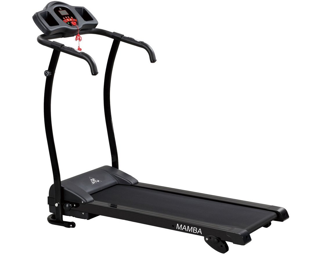 Электрическая беговая дорожка для занятий дома. Тренажер с гидравлической системой складывания и ручной регулировкой угла наклона. Контролировать частоту сердечных сокращений позволяют 2 встроенных в поручни датчика.